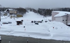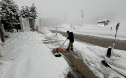 本日の蔵王温泉スキー場 2月13日の蔵王|今日も雪、雪、雪。お客様が快適にお越しいただけるよう、校長自らモンザ受付前の除雪しています