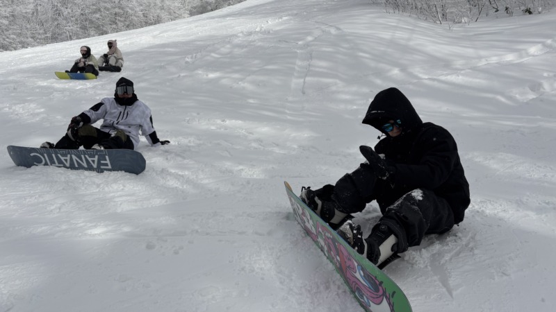 最後はこちらのお客様。福岡からお越しのお客様で、スノーボードの経験あり。今日が初滑りで、フォームのチェックと、急斜面でも安定して滑れるように…というレッスン内容で行いました。