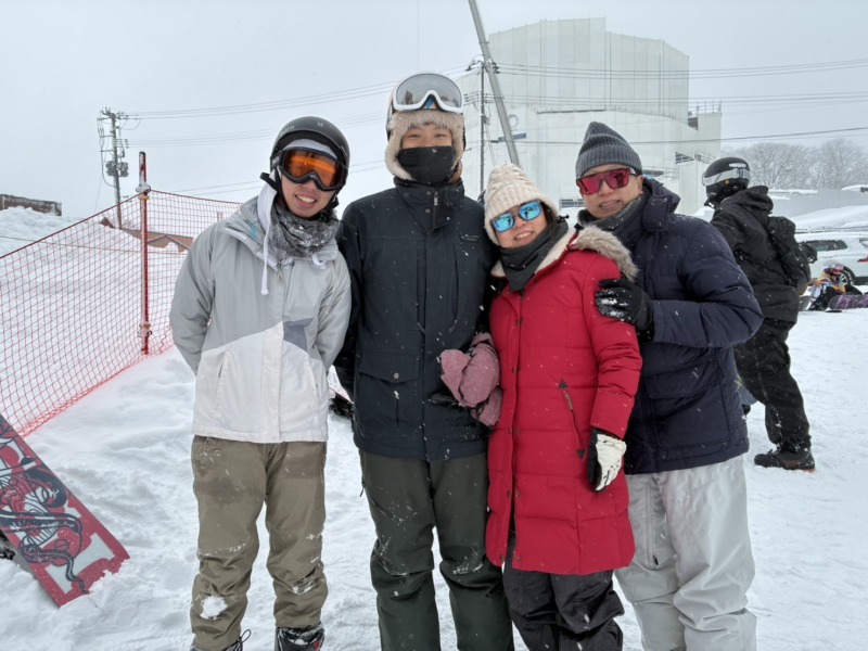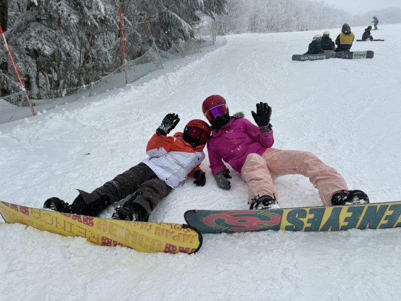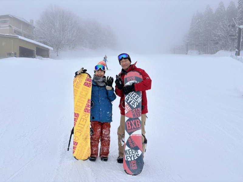 続いてはこちらのお客様。海外からのお客様で、新婚旅行中で、スノーボードを体験してもらいました。これからもスノーボード続けてほしいですね。