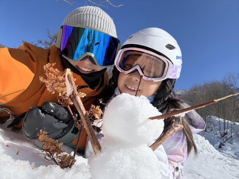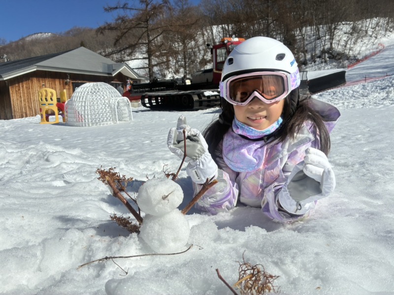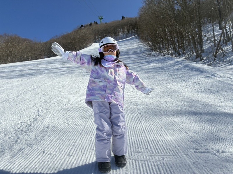 最初はこちらのお客様。人気のキッズレッスン。7歳の女の子。海外からのお客様。今日が二日目。この硬い雪の中で、1人で立ってサイドスリップができるようになりました。