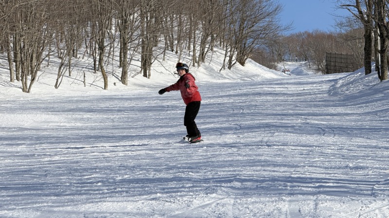 続いてはこちらのお客様。スノーボード経験あり。S字ターンができるようになり、後半にはいろんなゲレンデを滑り楽しみました。