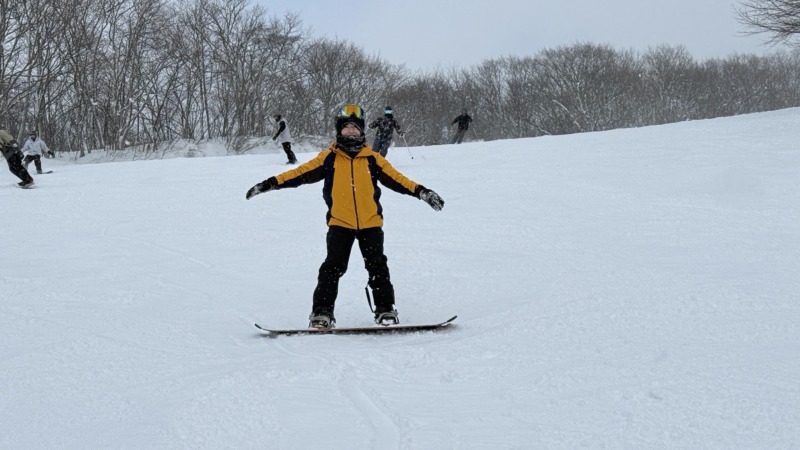 続いてはこちらのお客様。海外からのお客様。初めてのスノーボードにチャレンジ。最後まで楽しんでいただきました。
