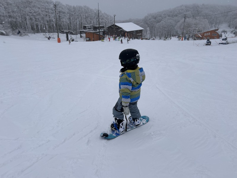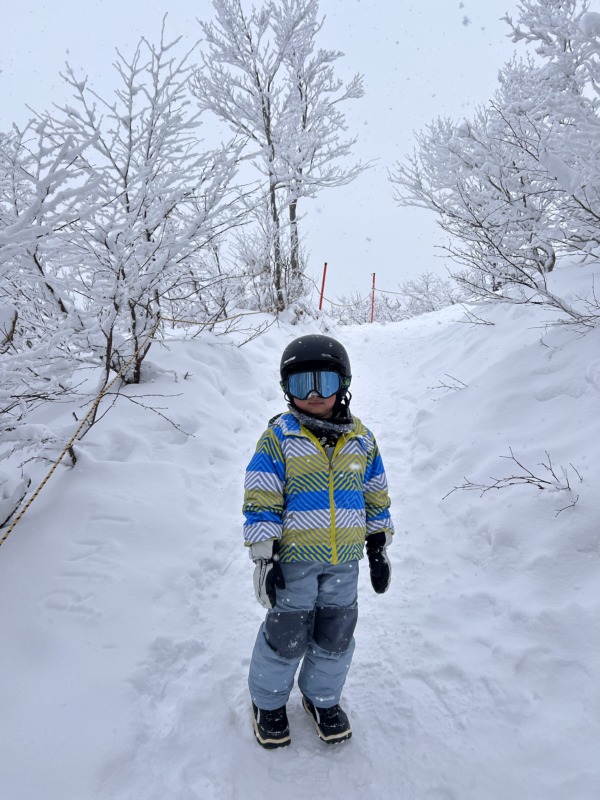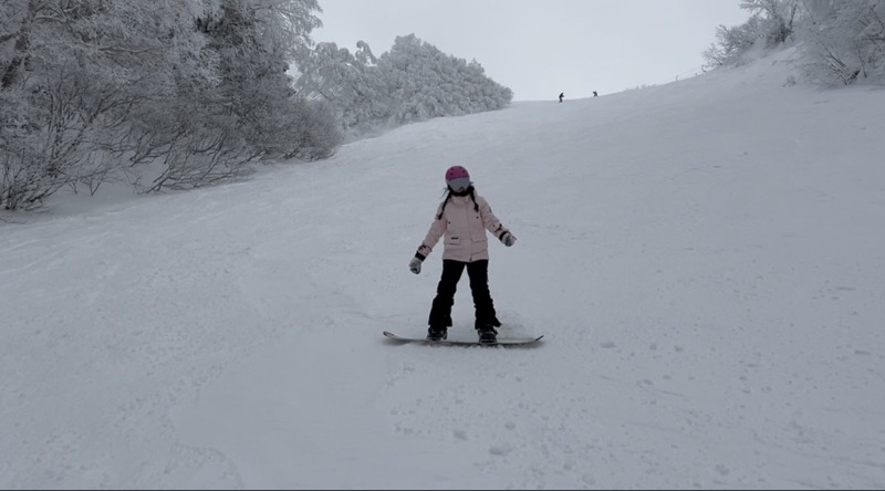 スムーズな連続ターンを練習し、最後にパラダイスコースで初の急斜面に挑戦。滑る前は緊張していましたが、見事に完璧なターンでかっこよく降りてくることができました!明日も滑るとのことで、ぜひまた挑戦してみてくださいね!