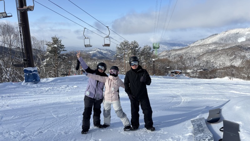 最後はこちらのお客様。海外からのお客様。去年スノーボードを初めて今回が2回目のスノーボード。なんとかS字ターンができるようになりたいとのことで、レッスン開始。サイドスリップはバッチリ‼︎その後ターンの練習をして、しっかりS字ターンができるようになりました。三人ともにテンションが高く、先生も圧倒されてました。