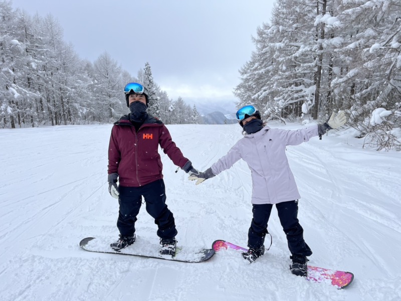 続いてはこちらのお客様。スノーボードの経験はありますが、うまくターンができないとのことで、レッスンにお越しいただきました。先生と意気投合して楽しいレッスンになりました。