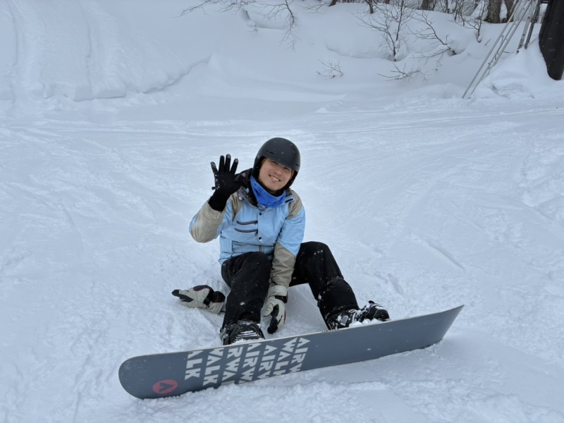 続いてはこちらのお客様。蔵王の雪はふわふわなので転んでもあまり痛くありません。いろいろレッスンメニューに果敢にチャレンジ。スノーボードを楽しんでいただきました。