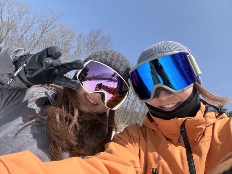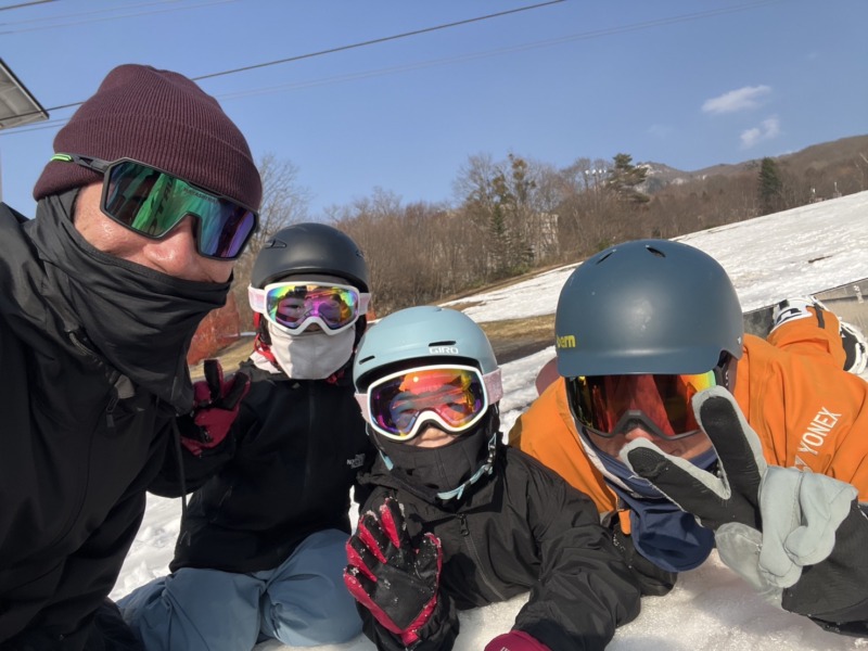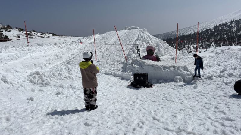 続いてはこちらのお客様。昨日に引き続き、四日間コースの二日目。海外のお客様で親子でレッスン。滑れるクラスだったので、山頂にチャレンジ。山頂のお地蔵さんにしっかり安全祈願を行いました。山頂の雪もだいぶ緩んできました。
