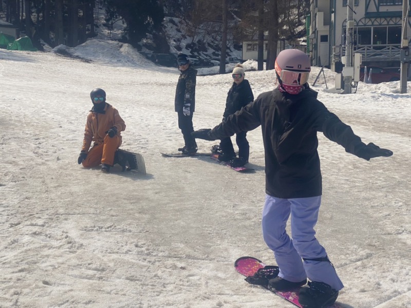続いてはこちらのお客様。初心者クラスのレッスン。持ち前の明るさとガッツでレッスン受講され、スノーボードが上手になりました。